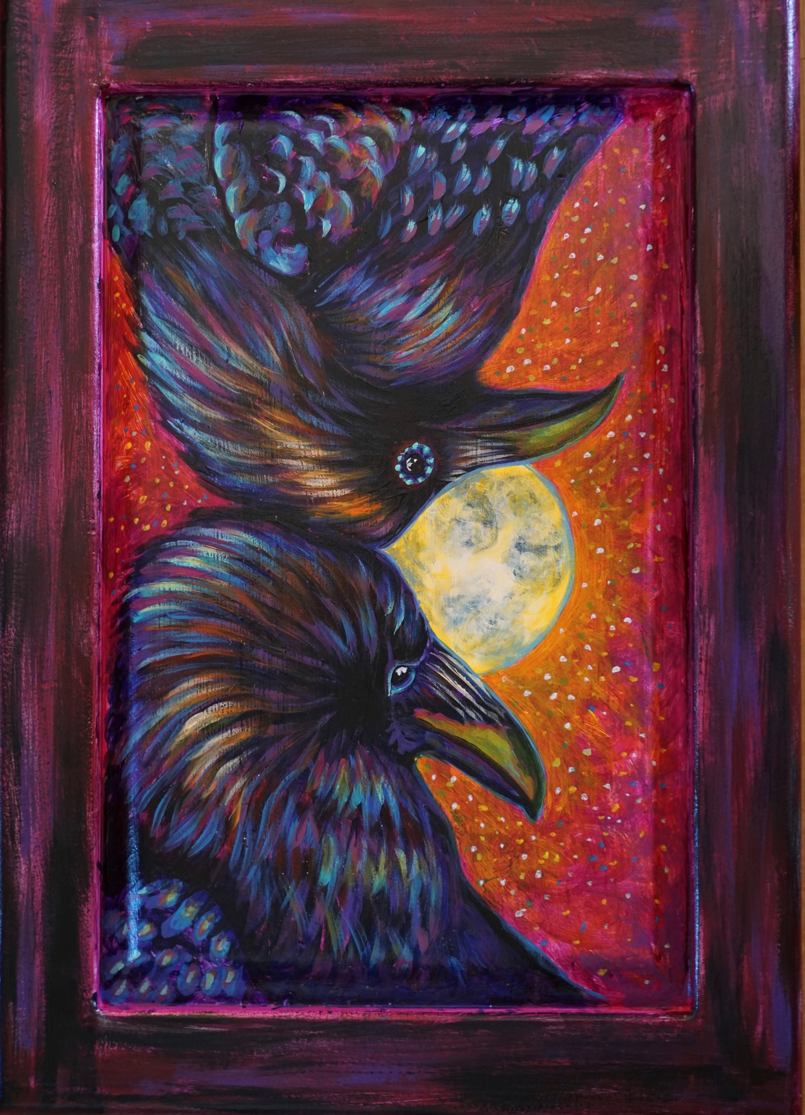 Two crows share a tender moment while the moonlight bathes the duo in a soft glow. The painting exudes an ethereal atmosphere filled with love.