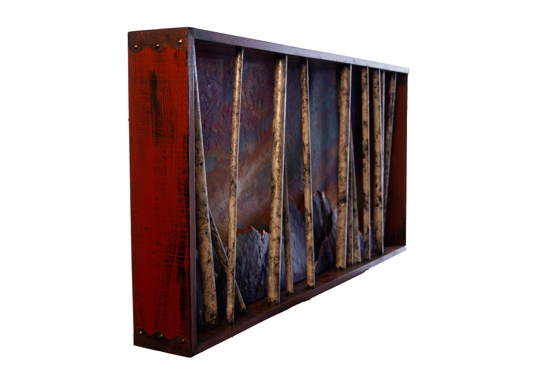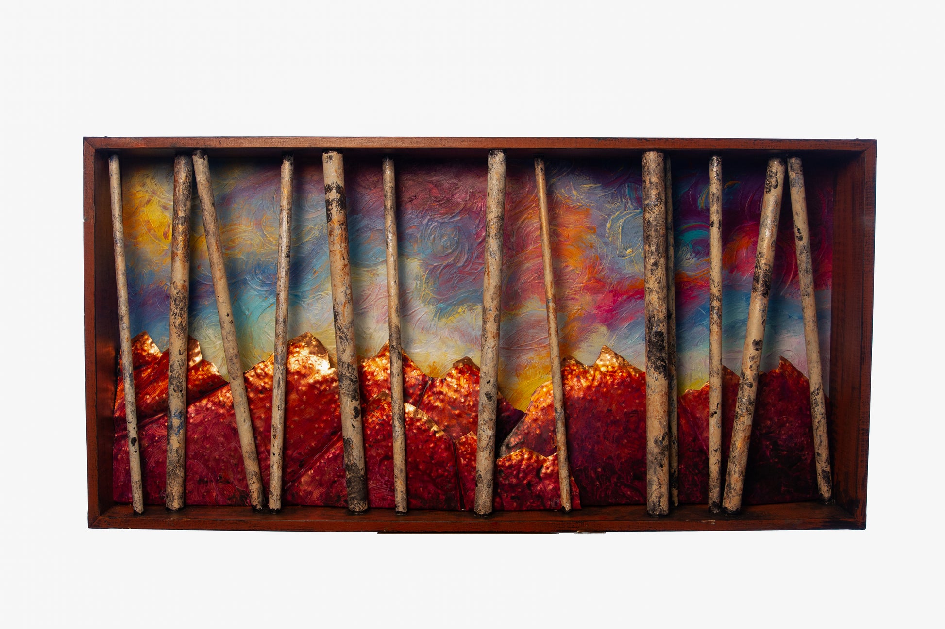 We've built The Aspen Series in a deep shadow box to create a magical scene for your imagination. Dramatically painted skies with free standing tricked out aspens combined with glazed actual copper mountains to make the forest vibe complete. We have included remote control mood lighting for nights you want a little mountain sunset ambiance with LED's. Wall or shelf mount.