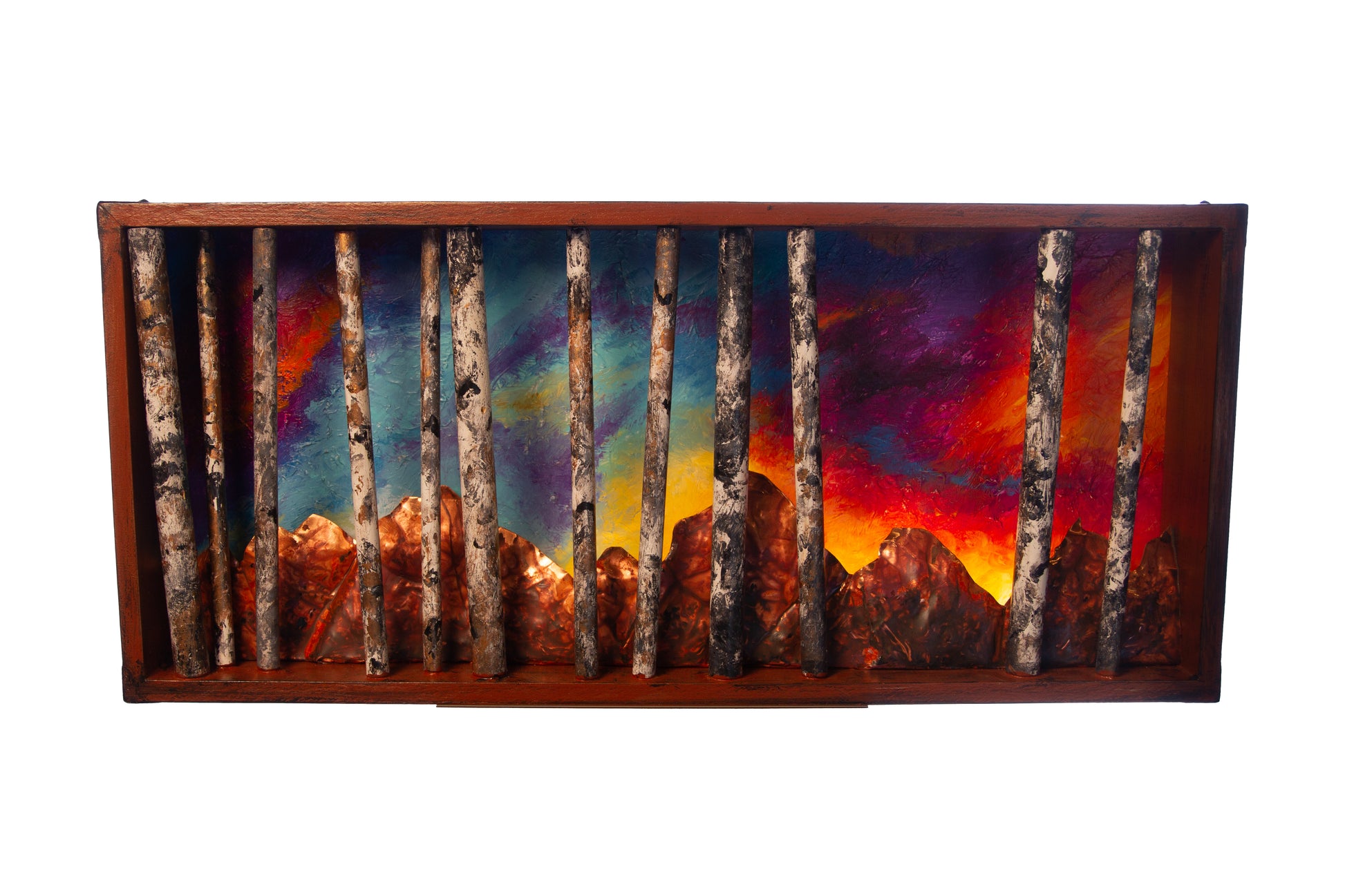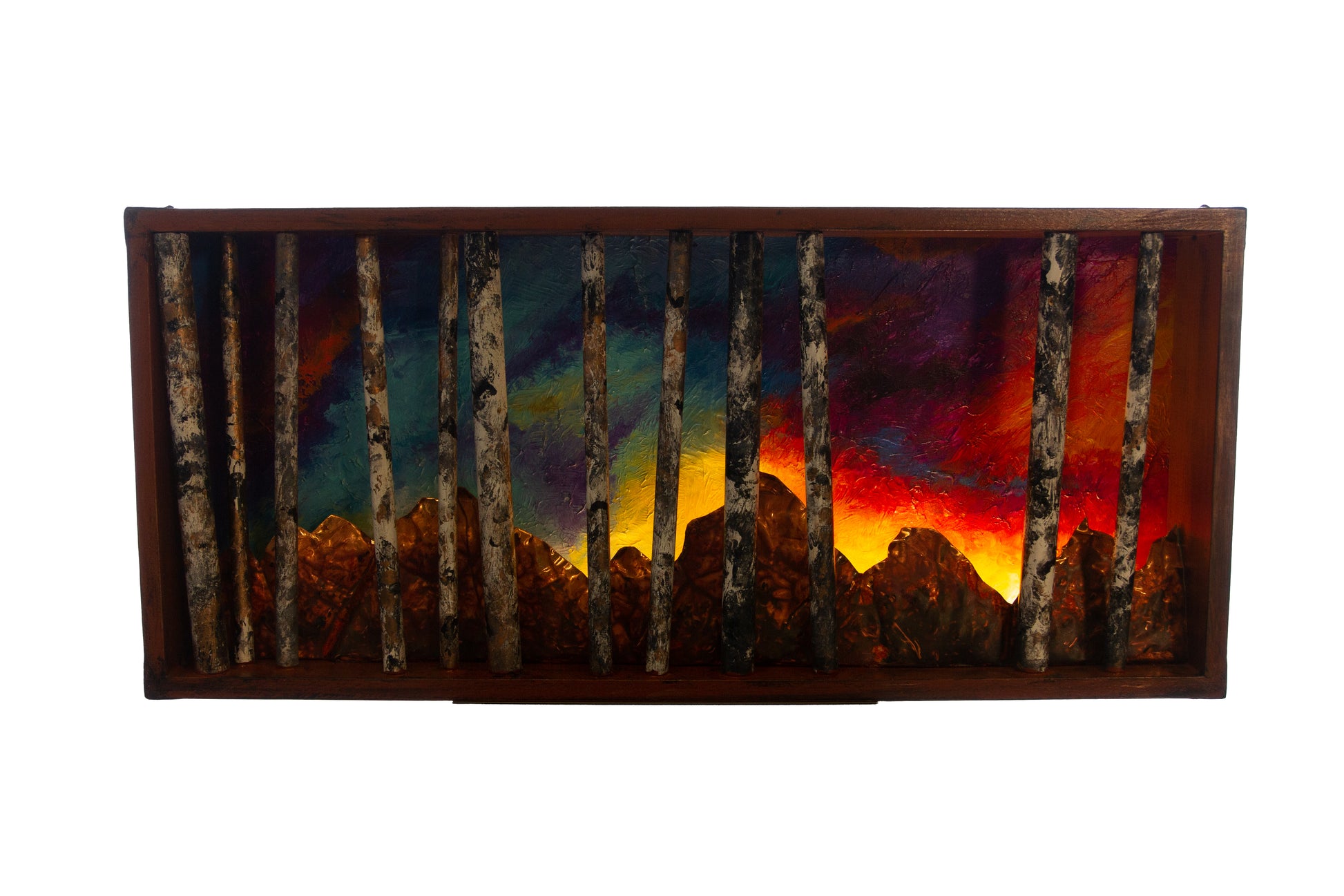 We've built The Aspen Series in a deep shadow box to create a magical scene for your imagination. Dramatically painted skies with free standing tricked out aspens combined with glazed actual copper mountains to make the forest vibe complete. We have included remote control mood lighting for nights you want a little mountain sunset ambiance with LED's. Wall or shelf mount.