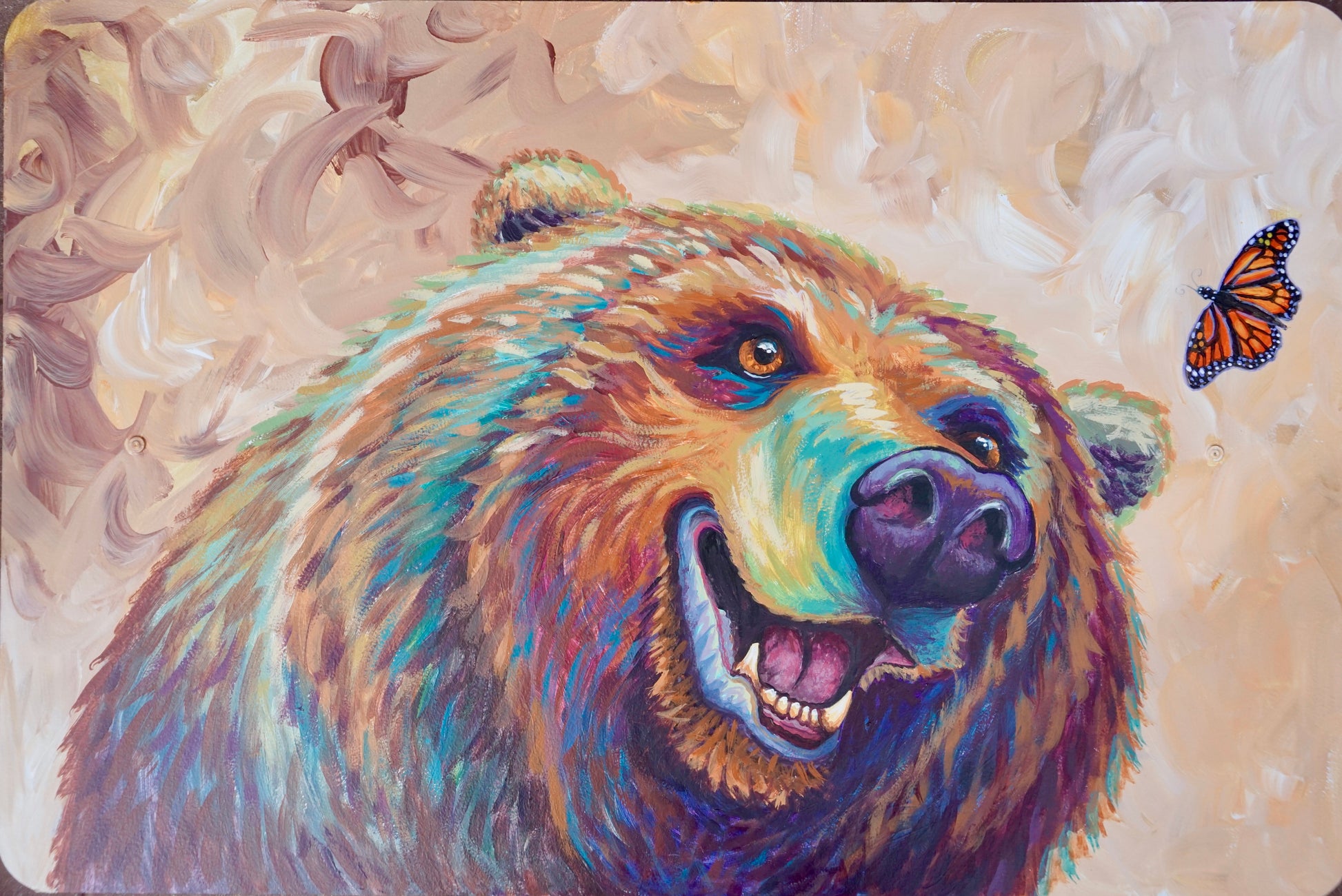 It perfectly captures that fleeting instance where two vastly different creatures share a connection that transcends their natural roles. The bear's smile radiates a surprising tenderness inviting you to pause and appreciate the present moment.